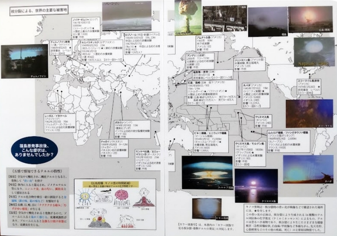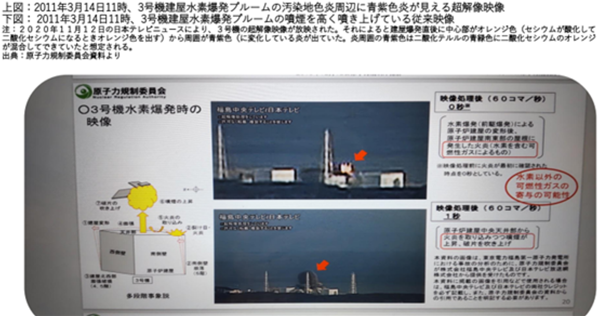 テルル資料選択表 ◆01世界の核実験、原発事故現場のキノコ雲やプルームの青い光映像◆021米軍ビキニ環礁核実験の青い光映像集◆022同上:核分裂後のキノコ子雲(動画)◆03福島原発3号機の建屋水素爆発時の炎 ・031a画像:原子力規制委員会資料より1 ・031b画像:原子力規制委員会資料より2 ・032資料 :原子力規制委員会資料 ・033動画 :youtube◆04福島第一原発の1号機,2号機,3号機放出プルーム中のテルル(Te)が 燃えて青緑色や 青色を出し二酸化テルル(TeO2)になる可視化映像◆05同上(解説文付き)◆06福島第一原発から放出されたプルームによる茨城県、埼玉県、千葉県、東京都、神奈川県における被ばくプルームと放射能濃度(Bq/m3)の確認◆071都6県のSPM観測局における放射能・テルル汚染グラフ 福島県 茨城県 埼玉県 千葉県 東京都 神奈川県 宮城県◆08福島第一原発事故の初期段階でつくば市気象研究所で採取された球状セシウム・ボールの特性◆09CTBT福島第一原発事故後に群馬県高崎市のCTBT高崎観測とCTBT沖縄観測所で観測された大気粒子状放射性核種の時間変化◆10福島第一原発事故後に新潟県南魚沼市に飛来したP3,P8による大気放射能ダスト、雪水などの放射性核種別のCs-137比◆11東京都SPM観測局における福島原発放出プルーム飛来時の核分裂物質濃度◆12南相馬市玄米のスプリング8分析報告(平成27年5月22日)◆121福島県版の全がんと22部位トレンド解析◆122福島県24病院原発事故後MDC疾病増加倍率評価DPCデータより◆123テルル化合物の恐るべき10大毒性(パンフレット原稿)10月14日◆123aテルルとその無機化合物[MAKバリュードキュメンテーション、2006年(和文)◆123b「物質に関する基本的事項{11}テルルおよびその化合物(環境省)」◆13福島第一原発から放出された個々の放射性微小物質の放射能マイクロX線解析によるウラン検出と化学性状の分析◆14大気化学的知見を用いた大気環境保全技術の開発への貢献(鶴田治雄)